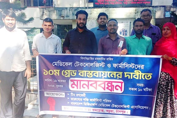 মানববন্ধনে বক্তরা বলেন- জীবন বাজি রেখে করোনা কালীন সময়ে , ডেঙ্গু ও বিভিন্ন স্বাস্থ্যঝুঁকি নিয়ে কাজ করলে ও টেকনোলজিস্টরা এখনো ন্যায্য গ্রেড থেকে বঞ্চিত।