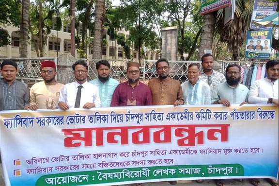 বক্তারা আরো বলেন, ‘পতিত আওয়ামী লীগ সরকারের সময়ে তৈরি করা চাঁদপুর সাহিত্য একাডেমীর সদস্য ভোটার তালিকায় চাঁদপুর জেলা বিএনপির সভাপতি শেখ ফরিদ আহম্মেদ মানিক সাহেবের বাসভবনে অগ্নিসংযোগ মামলা, বৈষম্য বিরোধী আন্দোলনে ছাত্র-জনতার উপর হামলার মামলার পলাতক ও জেলখানায় আটক আসামি রয়েছে। এছাড়াও বৈষম্য বিরোধী ছাত্র আন্দোলনের বিপক্ষে এবং গণহত্যার পক্ষে অবস্থানকারী বিতর্কিত আওয়ামী ফ্যাসিবাদ ও ফ্যাসিবাদের দোসর রয়েছে।
