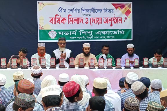 চাঁদপুর: চাঁদপুর মডার্ন শিশু একাডেমীতে পঞ্চম শ্রেণীর শিক্ষার্থীদের বিদায় উপলক্ষে দোয়া ও মিলাদ মাহফিল অনুষ্ঠিত হয়েছে।
