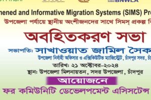 চাঁদপুর : চাঁদপুরে সেন্টার ফর কমিউনিটি ডেভেলপমেন্ট এসিসটেন্সের আয়োজনে উপজেলা পর্যায়ে স্থানীয় অংশীজনদের নিয়ে শক্তিশালী এবং তথ্যপূর্ণ মাইগ্রেশন সিস্টেম (সিমস্) প্রকল্প বিষয়ক অবহিতকরণ সভা অনুষ্ঠিত হবে।